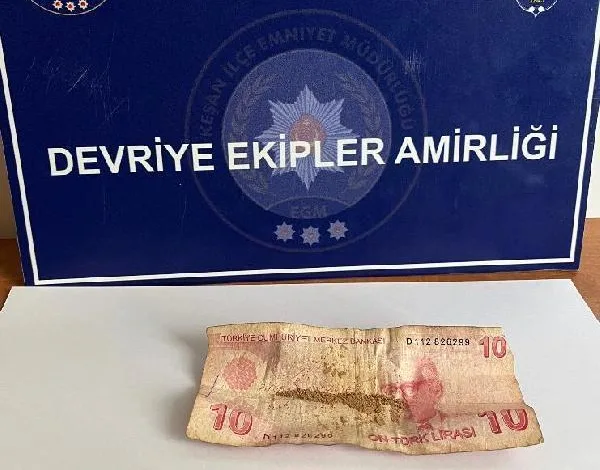 Ünsal YÜCEL/EDİRNE,(DHA)-EDİRNE’nin Keşan ilçesinde polis tarafından durdurularak üzeri aranan E.İ.’nin cebinden çıkan 10 liralık banknotun içerisinde 1 gram eroin ele geçirildi.