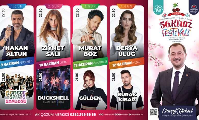 Süleymanpaşa Belediyesi tarafından organize edilen ve bu yıl 56’ncısı düzenlenecek olan Uluslararası Tekirdağ Kiraz Festivali, 9-12 Haziran 2022 tarihleri arasında gerçekleştirilecek. Çok sayıda etkinliğe ev sahipliği yapacak olan 56. Uluslararası Tekirdağ Kiraz Festivali’nin programı belli oldu.