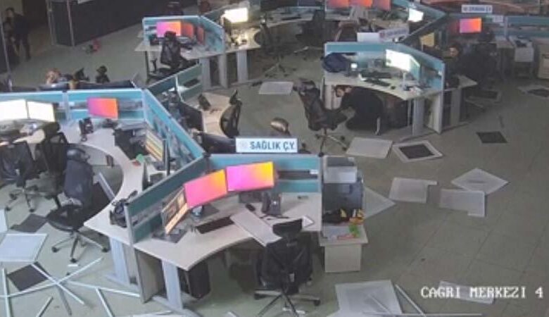 Sabaha karşı meydana gelen ilk depremde 112 Acil Çağrı Merkezi’nde yaşanan anlara ilişkin güvenlik kamerası görüntüleri ortaya çıktı. Sarsıntıyla birlikte paniğe kapılan görevlilerin bir süre kendilerini korumaya aldıkları, sarsıntının bitmesinin ardından ise tekrar çağrı almaya devam ettikleri görüldü. Merkezin asma tavanında küçük çaplı hasarın meydana geldiği deprem sırasında görevlilerin soğukkanlılığı dikkat çekti.