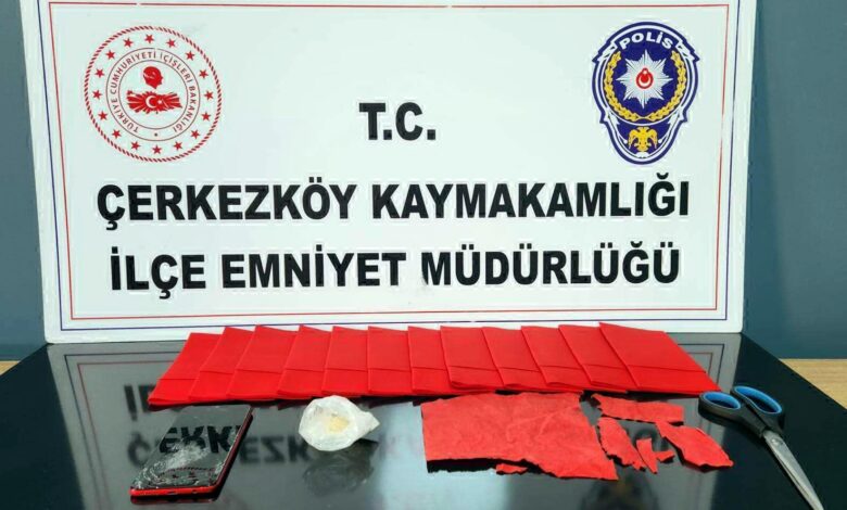 Çerkezköy’de emniyete yapılan aile içi şiddet ihbarı üzerine adrese giden polis ekipleri, şiddet uyguladığı iddia edilen C.Y.’nin hareketlerinden şüphelendi. Yapılan incelemede uyuşturucu satışı yaptığı gerekçesiyle teknik ve fiziki takibe alınan C.Y.’nin evinde yapılan aramada 5,10 gram amfetamin, amfetamin emdirilmiş 7 peçete, 12 basıma hazır peçete, peçete kesiminde kullanılan makas, cep telefonu ele geçirildi,. Gözaltına alınan C.Y., sevk edildiği adliyede çıkarıldığı mahkemede tutuklandı. (DHA)