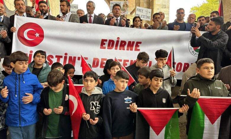 Adalet Bakanı Yılmaz Tunç, Edirne Adliyesi ve Edirne Barosu’nu ziyaret etti. Cuma namazını Eski Cami’de kılan Bakan Tunç, namaz çıkışı Filistin’e Destek Platformu tarafından gerçekleştirilen basın açıklamasına katıldı. Burada konuşan Bakan Tunç, “Onları topraklarından etmek, onların ülkesini işgal etmek için asırlık bir politika izliyor. Maalesef uluslararası hukuku sürekli ihlal ediyor. Birleşmiş Milletler’in kararlarını gerek Genel kurul kararlarını gerek Birleşmiş Milletler Güvenlik Konseyi’nin sayısız kararları var. Bugüne kadar uymadığı, uygulamadığı yüzlerce karar var. Filistin’e yönelik bu zulümleri maalesef 7 Ekim’den bu yana artık bir katliama, bir soykırıma dönüştü. 65 binden fazla Filistinli şehit edildi. Milyonlarca insan yerinden, yurdundan edildi. 100 bine yakın yaralı, şehirler yerle bir edildi. İnsanlığın gözü önünde, dünyanın gözü önünde bir soykırım suçu işlendi. Birleşmiş Soykırım Sözleşmesi’nin, Cenevre sözleşmelerinin bütün maddeleri ihlal edildi. Bu ihlaller nedeniyle İsrailli katliamcılar, İsrailli teröristler uluslararası adalet divanında, yargı huzurunda, yargılanmaya başlandı” dedi.