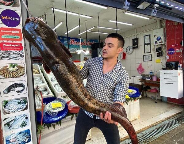 Tezgah önünde sergilenen yayın balığını gören Sevinç Türk, “İlk defa böyle bir balık gördüm. Benden yüksek, çok güzel” dedi. (DHA)