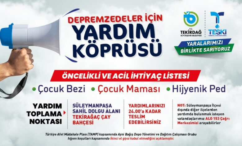 Öte yandan tüm Tekirdağlı vatandaşlarımızı da başlattığımız yardım kampanyasına destek vermeye davet ediyorum. Özellikle ilk etapta öncelikli olarak çocuk bezi, çocuk maması ve kadın pedi temini konusunda Süleymanpaşa ilçesi sahil dolgu alanda bulunan Tekirağaç Kafe’de vatandaşlarımızın getirecekleri malzemeleri kabul etmeye başladık.