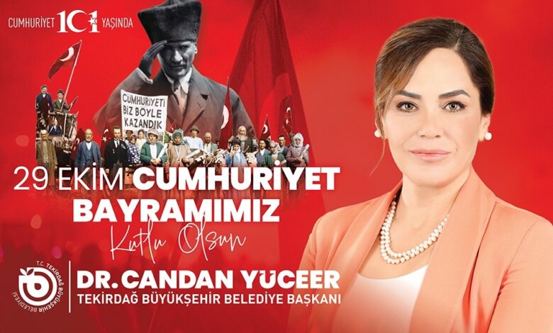 Tekirdağ Büyükşehir Belediye Başkanı Dr. Candan Yüceer, Türkiye Cumhuriyeti’nin 101. Kuruluş Yıldönümü ve 29 Ekim Cumhuriyet Bayramı dolayısıyla bir mesaj yayımladı. Candan Başkan, mesajında şu ifadelere yer verdi: