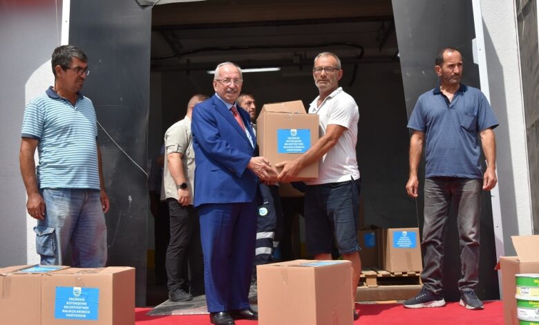 Konuşmaların ardından, tekne bakım malzemeleri, Tekirdağ Büyükşehir Belediye Başkanı Kadir Albayrak ve Tekirdağ Büyükşehir Belediyesi Genel Sekreteri Fatih Ünsal tarafından balıkçı esnafına dağıtıldı.