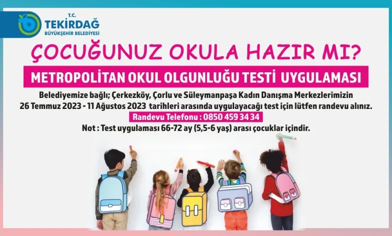 Sosyal belediyecilik anlayışının en iyi örneklerini hayata geçiren Tekirdağ Büyükşehir Belediyesi, birinci sınıfa başlayacak çocukların okula hazır olup olmadığını değerlendirme amacıyla Metropolitan Okul Olgunluğu testi uygulamasını başlattı. Başlatılan bu uygulama Çerkezköy, Çorlu ve Süleymanpaşa Kadın Danışma Merkezlerinde yapılacak.