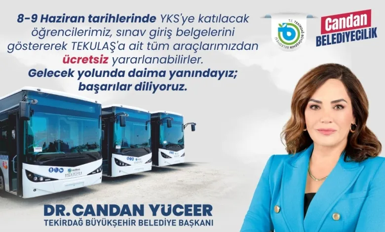 Konu ile ilgili olarak sosyal medya hesabından bir açıklama yayımlayan Tekirdağ Büyükşehir Belediye Başkanı Dr. Candan Yüceer, “Ülkemizin geleceği olan değerli evlatlarım; bu hafta sonu gireceğiniz Yükseköğretim Kurumları Sınavı nedeniyle, sınav giriş belgenizi göstererek TEKULAŞ’a bağlı tüm otobüslerimizden ücretsiz olarak yararlanabilirsiniz. Unutmayın ki, sonuç ne olursa olsun sizlerden daha kıymetli değil. Sizleri, hayalinizdeki geleceğe taşımak için daima buradayız. Her birinize başarılar diliyor, gözlerinizden öpüyorum” ifadelerini kullandı.