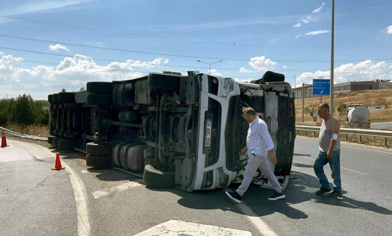 Ulaş Mahallesi’nden aldığı yükü Eskişehir’e götürmek üzere yola çıkan Mehmet Çallı yönetimindeki 26 AGC 558 plakalı TIR, çevre yolundan Çerkezköy yoluna dönerken kontrolden çıkarak devrildi.