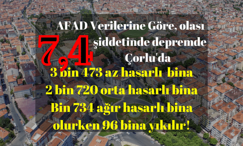 Afet ve Acil Durum Yönetimi Başkanlığının (AFAD) açıklamış olduğu verilere göre, Tekirdağ’da 7.4 şiddetinde deprem yaşanırsa Çorlu’da 96 binanın yıkılma ve binlerce binanın hasar alma riski bulunuyor.