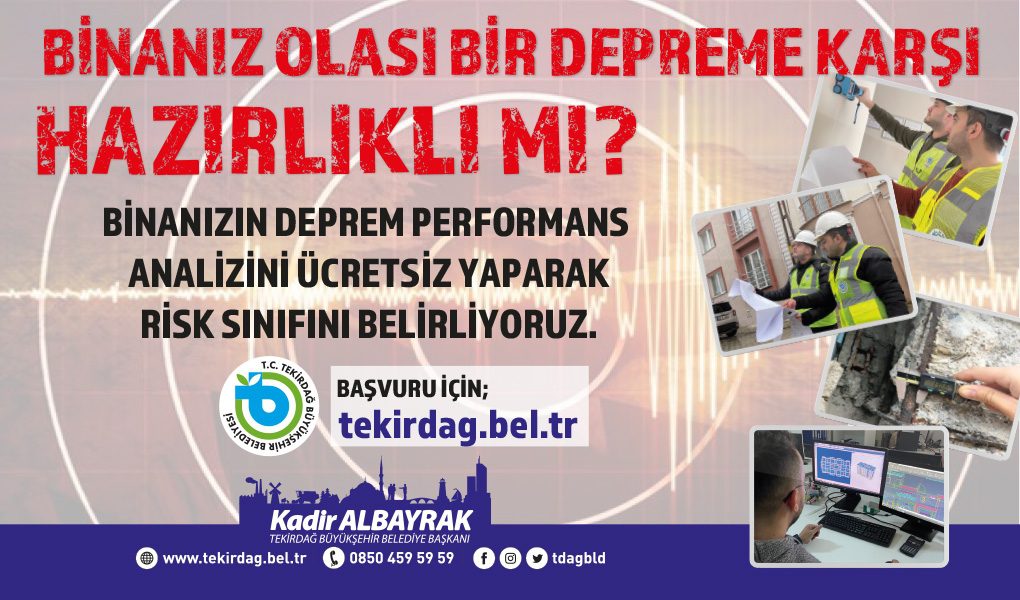 BÜYÜKŞEHİR BELEDİYESİ’NDEN ÜCRETSİZ DEPREM PERFORMANS ANALİZİ 28/02/2022 11:16:13 Tekirdağ Büyükşehir Belediyesi, Tekirdağ’ın deprem bölgesinde yer alması gerçeğini göz önünde bulundurarak…