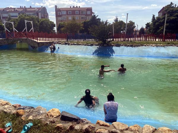Hava sıcaklığının 27 derece olduğu Edirne’de bir grup çocuk serinlemek için Şükrüpaşa Mahallesi’nde bulunan suni gölete girdi. Suda oyunlar oynayarak yüzüp serinlemeye çalışan çocuklar, olası tehlikeye aldırış etmedi. Çevrede bulunan vatandaşların da göletten çıkmaları yönünde uyarıda bulunduğu çocuklar, bu uyarıları aldırmadan serinlemeye devam etti. Çevredekilerin olası bir boğulmayı önlemek için durumu polise bildirdi. Bölgeye gelen polis ekipleri çocukları göletten çıkarıp uzaklaştırdı. (DHA)