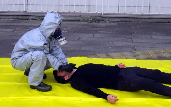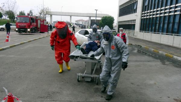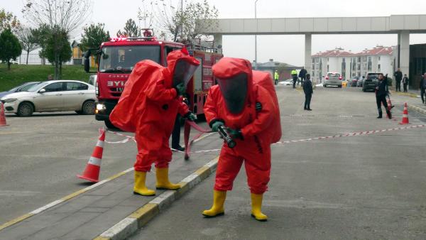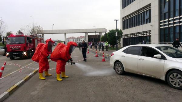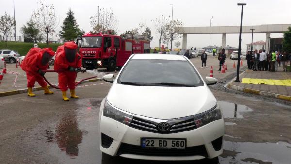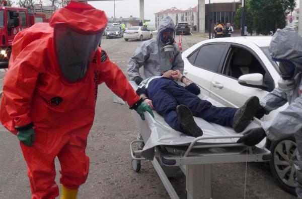 İl Sağlık Müdürlüğü, UMKE, AFAD ve itfaiye ekiplerinin katılımıyla ‘KBRN Saha Tatbikatı’ yapıldı. Edirne 1’inci Sultan Murat Devlet Hastanesi’ndeki tatbikatta, senaryo gereği otomobille kimyasala maruz kalarak zehirlenen 2 kişi geldi. Burada özel kıyafetli ve gaz maskeli sağlık ekipleri, yardım isteyenleri araçtan çıkarıp, branda üzerine yatırdı. Daha sonra korunaklı kıyafet giyen AFAD ve itfaiye ekiplerinin katılımıyla sedyeye konulan kişiler, hastanede KBRN bölümüne götürüldü. Bu sırada ambulansla kimyasala maruz kalan başka biri daha getirildi. Aynı bölüme alınan kişilere sağlık ekipleri tarafından gerekli müdahale başlatıldı. Tatbikatın yapıldığı alan, şerit çekilerek ekipler tarafından kimyasal giderici suyla yıkandı. Gerçeği aratmayan tatbikat başarıyla tamamlanırken ekipler de kimyasal, biyolojik, radyolojik ve nükleer zehirlenmelere karşı hazır olduklarını belirtti. (DHA)