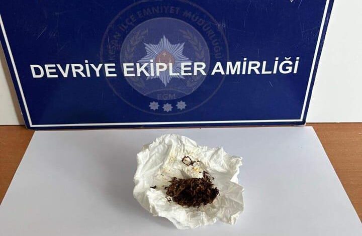 İlçe Emniyet Müdürlüğü ekipleri, yaptıkları denetimlerde Yörük Mahallesi Kayalıdere Sokak üzerinde durumundan şüphelendiği U.K.’yi durdurdu. Şüphelinin üzerinde peçeteye sarılı 3,41 gram uyuşturucuya bulanmış tütün ele geçirildi. U.K., gözaltına alındı. (DHA)