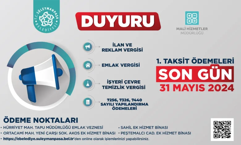 Süleymanpaşa Belediyesi, Emlak Vergisi, İlan ve Reklam Vergisi, İşyeri Çevre Temizlik Vergisi ve 7256, 7326, 7440 Sayılı Yapılandırma Ödemelerinin 1. taksitinin son ödeme tarihinin 31 Mayıs 2024 Cuma Günü olduğunu açıkladı.