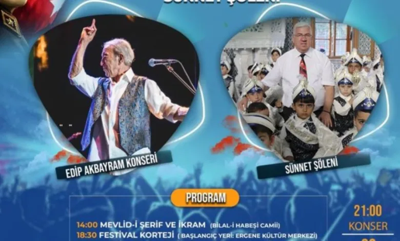 Ergene Belediyesi tarafından geleneksel hale getirilerek her yıl düzenlenen Sünnet Şöleni festivali bu senede düzenlenecek. Ergene Belediyesi tarafından gerçekleştirilecek olan 30 Ağustos Zafer Bayramı kutlamaları ve geleneksel sünnet şöleni festivalinde Anadolu rock müziğinin usta ismi Edip Akbayram konser verecek.