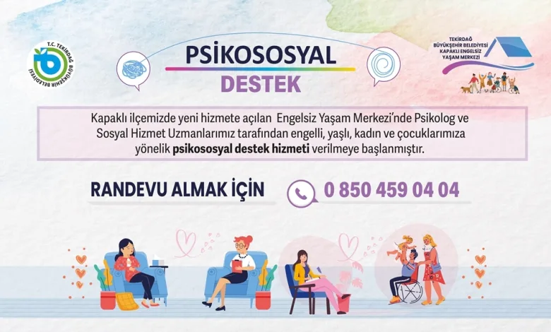 Tekirdağ Büyükşehir Belediyesi tarafından hizmete açılan Kapaklı Engelsiz Yaşam Merkezi’nde Psikolog ve Sosyal Hizmet Uzmanları tarafından verilecek psikososyal destek hizmeti için vatandaşlar 0850 459 04 04 numaralı telefondan ulaşarak randevu alabilecekler.