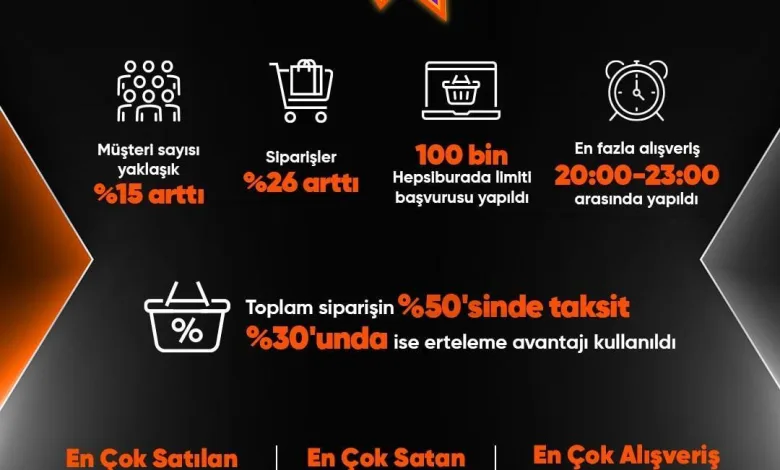 Kasım’ın ilk 5 gününde 100 milyon ziyaretçi indirimli ürünlere ulaşmak için yarıştı. Genelde akşam 21:00-22:00 saatleri arası online alışverişler yapılırken en çok satılan ürün deterjan oldu. İlk 5 günde 100 binin üzerinde müşteri ‘Hepsiburada Limiti’ başvurusu yaparken, kart limitleri etkilenmeden taksitli alışveriş yapan müşterilerin de yüzde 30’u erteleme imkanından yararlandı. Aile bütçelerini rahatlatan ‘Şimdi Al Şubatta Taksitle Öde’ teklifine de kullanıcılar yoğun ilgi gösterdi. Her iki taksitli alışverişten biri, şubat sonrasında taksitlendirme imkânı kullanılarak gerçekleştirildi.