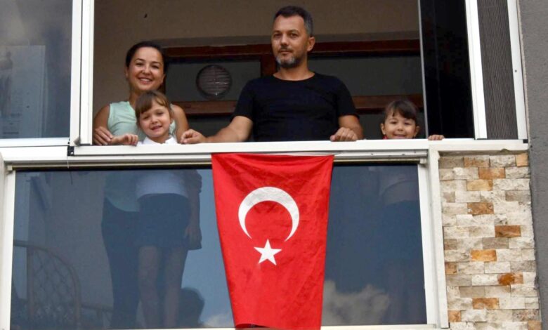 Mehmet YİRUN-Mehmetcan ARSLAN/TEKİRDAĞ, (DHA)- TEKİRDAĞ’ın Hayrabolu ilçesinde Sevtap ile Murat Karakaş çifti, çocukları Nil (6) ve Naz’ın (5) balkonda oynarken çöp konteynerine atılmış olarak gördükleri Türk bayrağını alıp, temizledikten sonra evlerinin balkonuna astı.