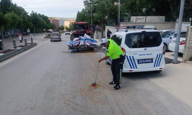 Keşan’a bağlı Yenimuhacir beldesinde besicilik yapan Mehmet Sel (60), ilçeden aldığı yemleri traktörünün arkasına bağlı aparata yükleyerek yola çıktı. Sel’in kullandığı 59 LN 859 plakalı traktörün arkasındaki çuvallardan bazıları İspat Cami Mahallesi Kurtuluş Caddesi’nde yola düşerek patladı. Keşan İlçe Emniyet Müdürlüğü Trafik Denetleme Büro Amirliği ekipleri, durumu fark edip yolda güvenlik önlemi alarak, cadde üzerine saçılan yemleri süpürgeyle toplayarak, çuvallara koydu. Mehmet Sel, kendisine yardımcı olan polis ekiplerine teşekkür etti. Yemlerin caddeden toplanmasıyla trafik yeniden normal seyrine döndü. (DHA)