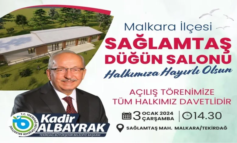 Cumhuriyet’in 100. Yılında Tekirdağ’da 100. yıla yakışır dev yatırımları vatandaşların hizmetine sunan, geniş hizmet yelpazesi ile toplumun her kesimine hitap eden projeleri hayata geçiren Tekirdağ Büyükşehir Belediyesi tarafından yapımı tamamlanan Malkara İlçesi Sağlamtaş Mahallesi Düğün Salonu 03 Ocak 2023 Çarşamba Günü saat 14.30’da gerçekleştirilecek törenle hizmete açılacak.