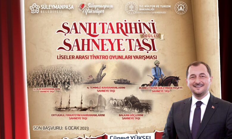 Süleymanpaşa Belediyesi tarafından “Şanlı Tarihini Sahneye Taşı” sloganıyla ilçede faaliyet gösteren liseler arasında düzenlenen tiyatro yarışması, 5 farklı kategoride gerçekleştirilecek. Ekipler diledikleri kategoride bir eser sahneleyebilecek.