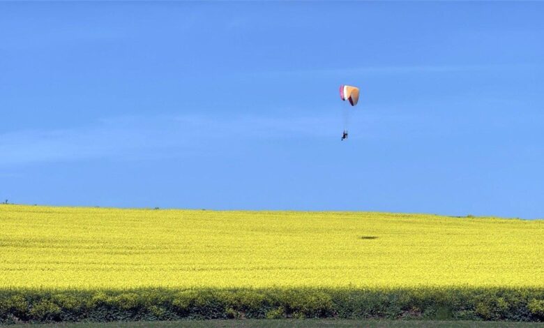 / TEKİRDAĞ, (Haber Merkezi)- TEKİRDAĞ’da paraşüt eğitmeni Kadir Aksoy, sarı renge bürünen kanola tarlaları üzerinde paramotorla uçtu.