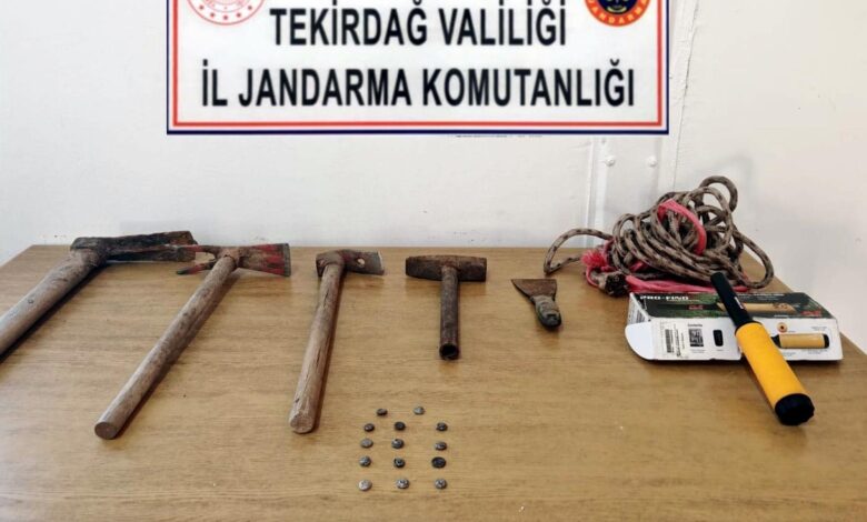 Şarköy İlçe Jandarma Komutanlığı ekipleri, Mürefte Mahallesi’nde C.Ç., O.C. ve S.A.’nın , bulunduğu araçta arama yaptı. Aramada, tarihi olduğu değerlendirilen 14 sikke, kaçak kazıda kullanılan çapa, kazma, keser, çekiç, spatula, el pointeri ele geçirildi. Gözaltına alınan 3 şüpheliyle ilgili soruşturma sürüyor. (DHA)