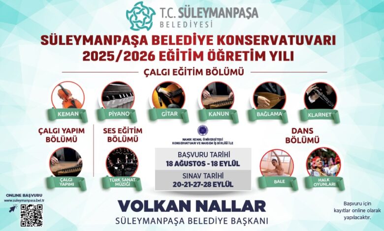 Süleymanpaşa Belediyesi Konservatuvarı, 2025/2026 eğitim öğretim yılı için kayıtlarını başlattı. Namık Kemal Üniversitesi Konservatuvar ve Halk Dansları Topluluğu ile iş birliği içinde yürütülen eğitim programı kapsamında; Çalgı Eğitimi, Ses Eğitimi, Dans ve Çalgı Yapımı bölümlerinde geniş bir yelpazede konservatuvar seviyesinde eğitim verilecek.