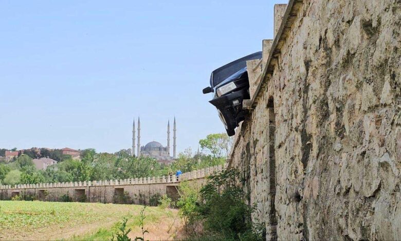 Umut IŞIK/EDİRNE, (DHA)- EDİRNE’de tarihi Saraçhane Köprüsü’nün bariyerine çarpan otomobilin asılı kaldığı kazada sürücü T.G., yaralandı.