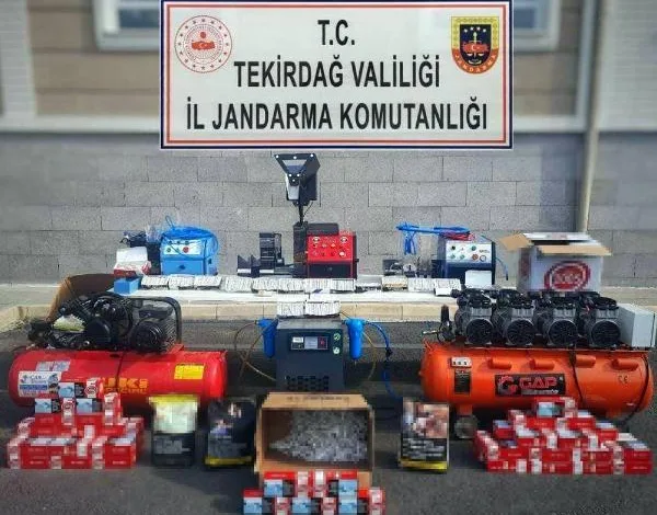 İl Jandarma Komutanlığı ekiplerinin yaptığı çalışmada Çerkezköy ilçesinin Fatih Mahallesi’nde M.Y.’nin iş yerinde kaçak tütün ve tütün ürünleri bulunduğu belirlendi. İş yerinde jandarmanın yaptığı aramada 10 bin boş makaron, 5 bin dolu makaron, 3 kilogram bandrolsüz tütün, 3 tam otomatik kompresör ile çalışan makaron doldurma makinesi , 2 kompresör, 1 tütün nemlendirme makinesi ele geçirildi. Piyasa değerin 395 bin lira olduğu belirtilen ürünlerle ilgili gözaltına alınan M.Y., hakkındaki işlem sürüyor. (DHA)