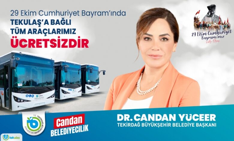 Konuya ilişkin bir açıklama yapan Tekirdağ Büyükşehir Belediye Başkanı Dr. Candan Yüceer, “Ülke tarihimizin en önemli günlerinden birinde elbette Tekirdağ halkının kendini özel hissetmesini sağlamak ve ekonomik olarak destek olmak en önemli görevlerimizden biridir. Bu görevimizi layığıyla yerine getirdiğimiz için mutluyuz. 29 Ekim Cumhuriyet Bayramı’nda vatandaşlarımızın bayram coşkusunu en güzel şekilde yaşamaları için toplu taşıma araçlarımızı ücretsiz hale getirdik. Amacımız, hemşehrilerimizin gün boyunca rahatça seyahat edebilmesi ve etkinliklere katılabilmesidir. Tekirdağ Büyükşehir Belediyesi olarak, şehir içi ulaşımı kolaylaştırmak için gereken tüm önlemleri aldık. Tüm halkımıza mutlu ve huzurlu bir bayram dilerim” dedi.