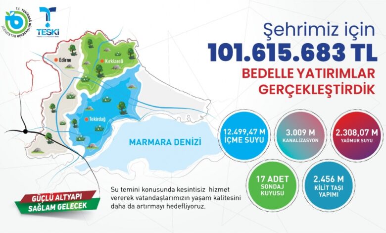 Tekirdağ Su ve Kanalizasyon İdaresi Genel Müdürlüğü su temini konusunda kesintisiz hizmet vererek vatandaşların yaşam kalitesini artırmayı hedefliyor. Yatırımlar kapsamında Tekirdağ genelinde toplam 102.000.00 TL harcama yapılarak; 12.500 metre içme suyu hattı, 3.009 metre kanalizasyon hattı ve 2.308 metre yağmur suyu hattı tesis edildi. Ayrıca; su sıkıntısı yaşayan bölgelerde 17 adet su sondaj kuyusu açıldı. Üst yapı düzenlenmesine yönelik 2.450 m² kilit taş yapımı tamamlandı.