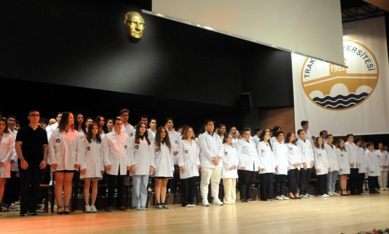 T.. Tıp Fakültesi Balkan Kongre Merkezi’nde, 2025-2026 eğitim ve öğretim yılında Tıp Fakültesi’ni kazanarak kayıt yaptıran 261 öğrenci için beyaz önlük töreni yapıldı. Törene Edirne Valisi Yunus Sezer, T.Ü. Rektörü Prof.Dr. Mustafa Hatipler, İl Sağlık Müdürü Mustafa İshak Yıldırım, fakülte dekanları, öğretim üyeleri, öğrenciler ve aileleri katıldı.